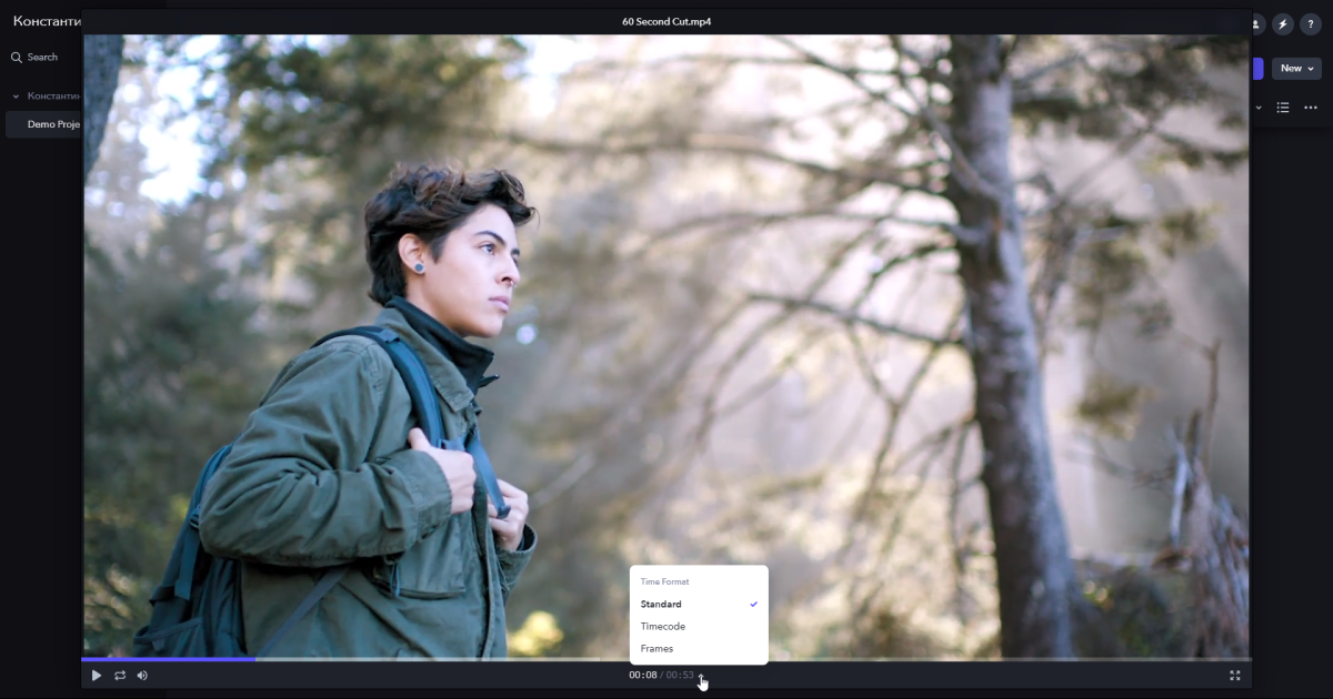 При нажатии на пробел открывается полноценный плеер с выбранным видео, в котором есть возможность выбора отображения времени в секундах, таймкодах или кадрах.