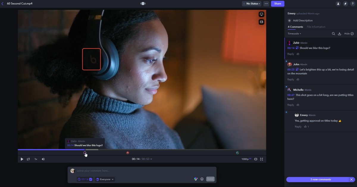 При переходе в просмотрщик видео начинается «магия». Любой член команды может добавлять свою пометку к любому кадру видео с помощью комментариев. При этом есть возможность использовать простые инструменты аннотации, а сам комментарий сделать доступным только определённым людям. Все комментарии и обсуждения расположены на правой панели. Комментарии можно помечать как «Выполненные» и копировать между клипами.
