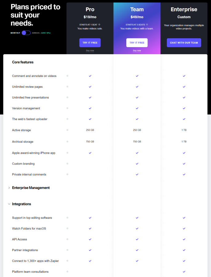 Стоимость Frame.io зависит от размера команды, и есть тариф даже для одиночек вроде меня.