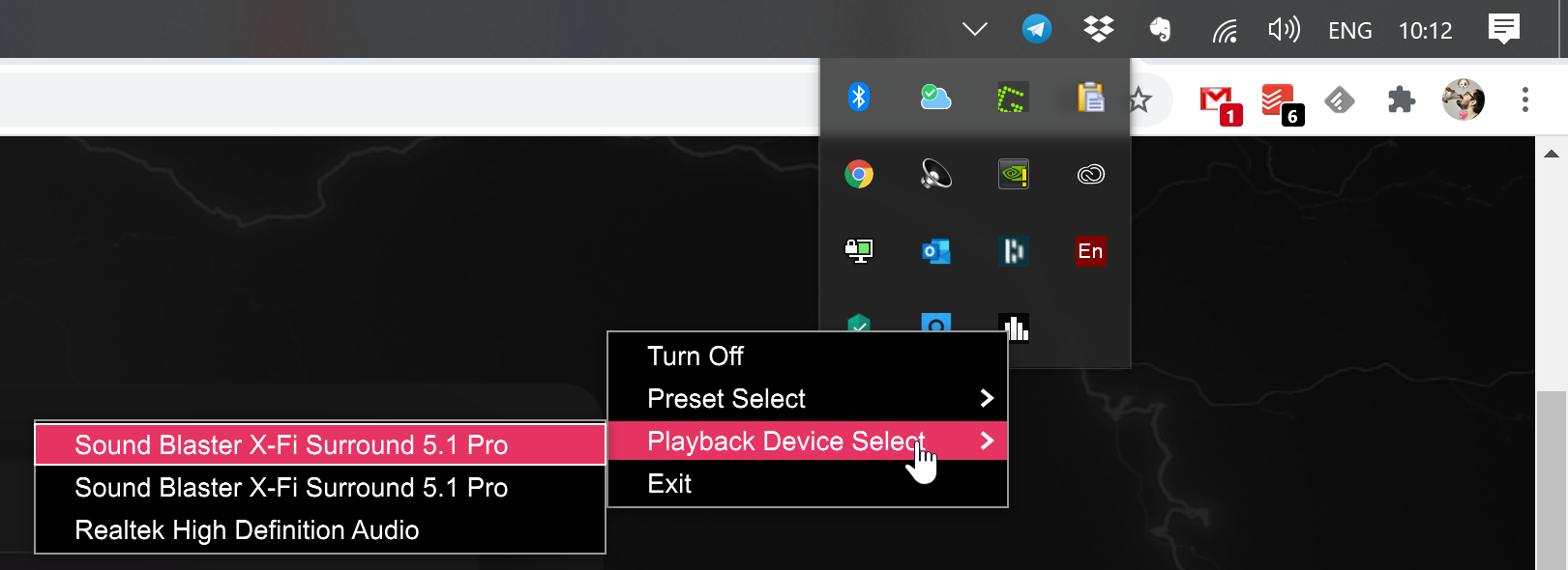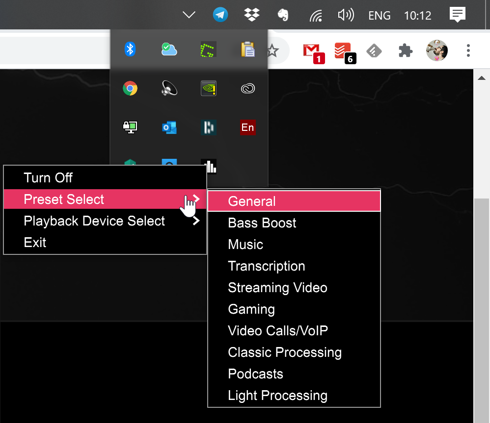 После запуска всё довольно просто. Из контекстного меню приложения в трее или самого приложения вы можете быстро поменять пресеты эквалайзера или указать устройство вывода.