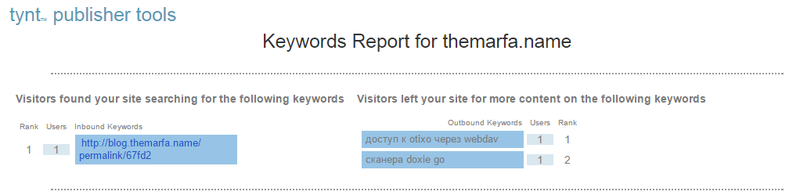 Кроме запросов к сайту, есть запросы, по которым пользователи покидают ваш сайт. Такую информацию помогает собрать Tynt. Этот скрипт позволяет отследить по каким словам читатели покидают ваш сайт. Отчет будет приходить к вам на почту: