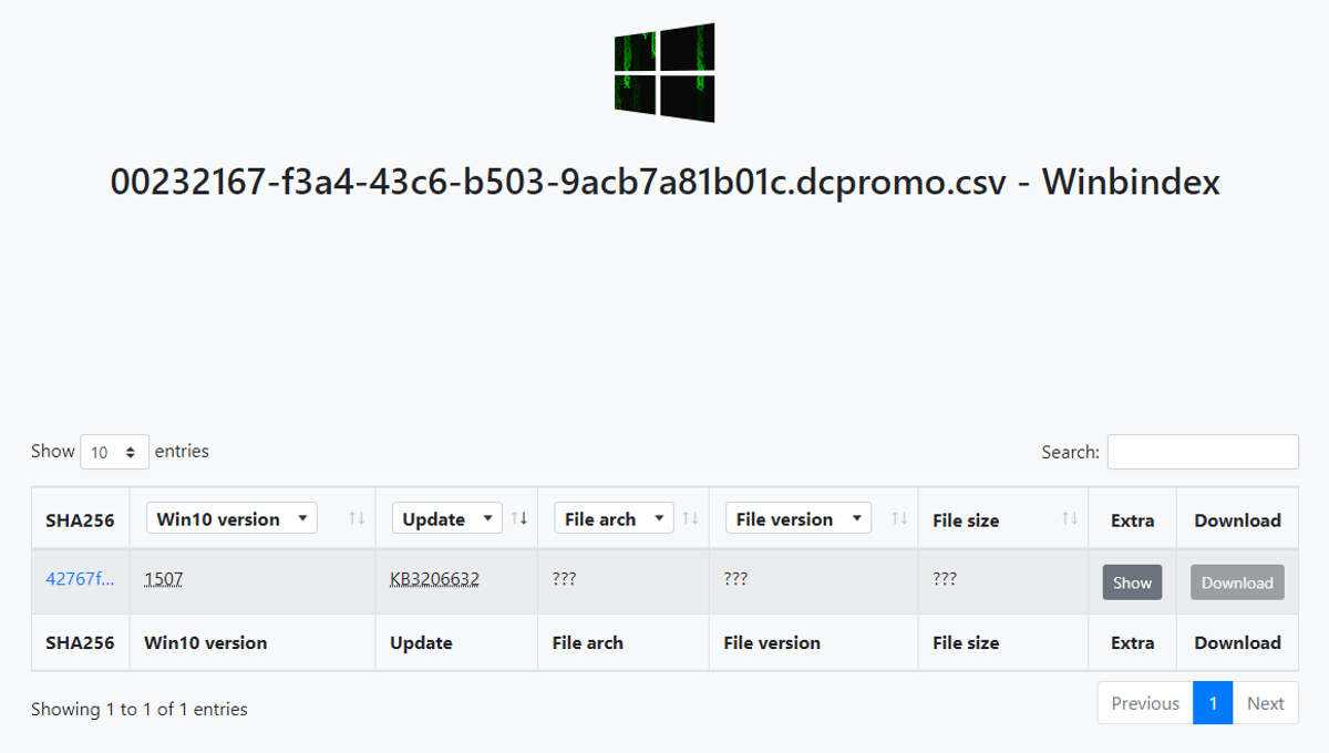 При нажатии на результаты поиска отображается сводная информация по выбранному файлу. Среди данных есть SHA-хеш файла, версия Windows 10, ссылка на Windows Update, версия файла и прочее.