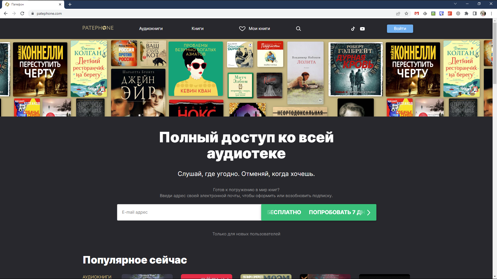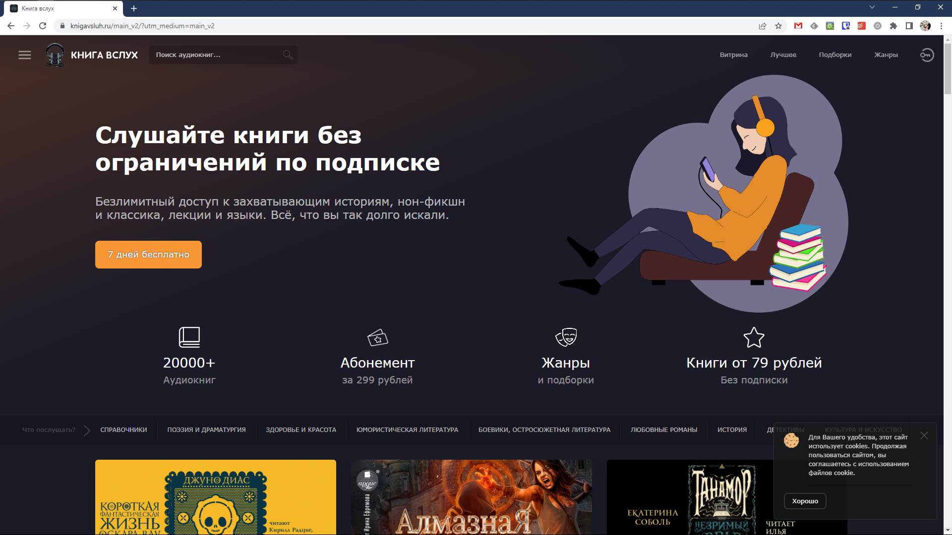 Этот сервис с аудиокнигами не относится к числу самых популярных, но подписка стоит меньше, чем у описанных выше. Библиотека включает свыше 11 000 наименований, а тридцать первых книг доступны для бесплатного прослушивания.