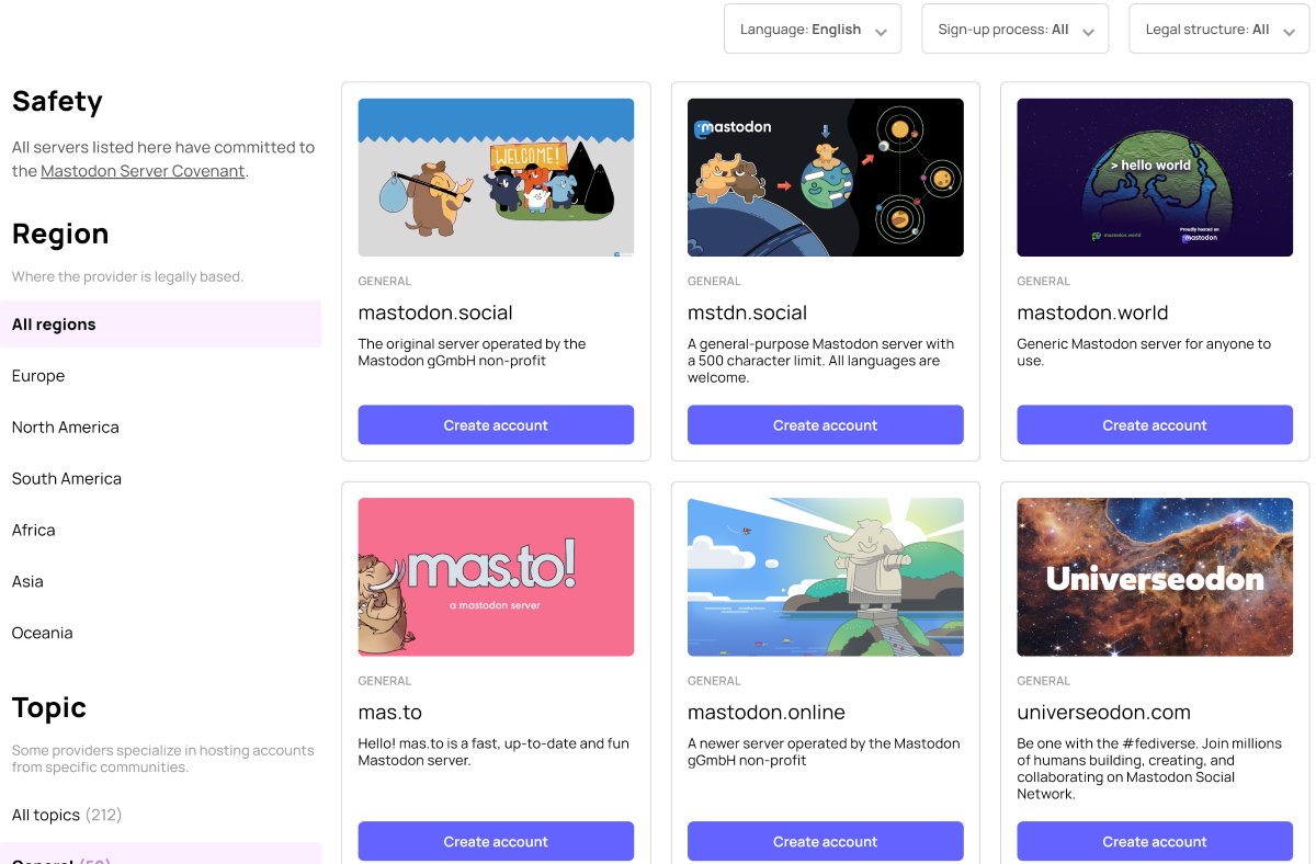 Начать стоит с официального сайта Mastodon, на котором в отдельном разделе можно найти серверы с помощью фильтров по языку, региону, теме или другим параметрам.