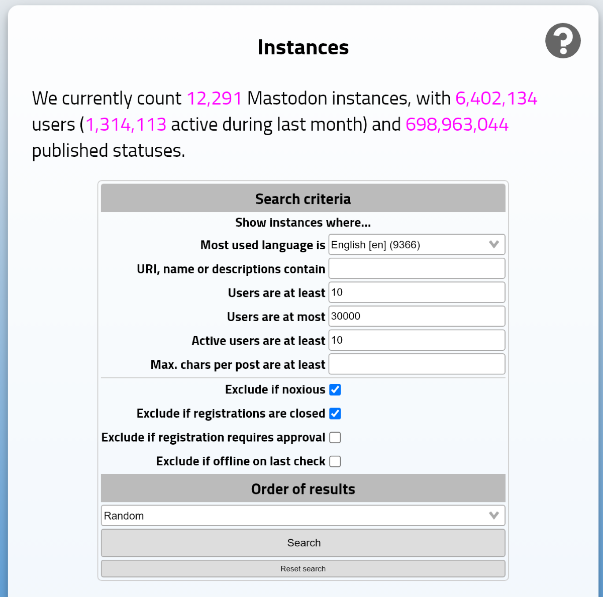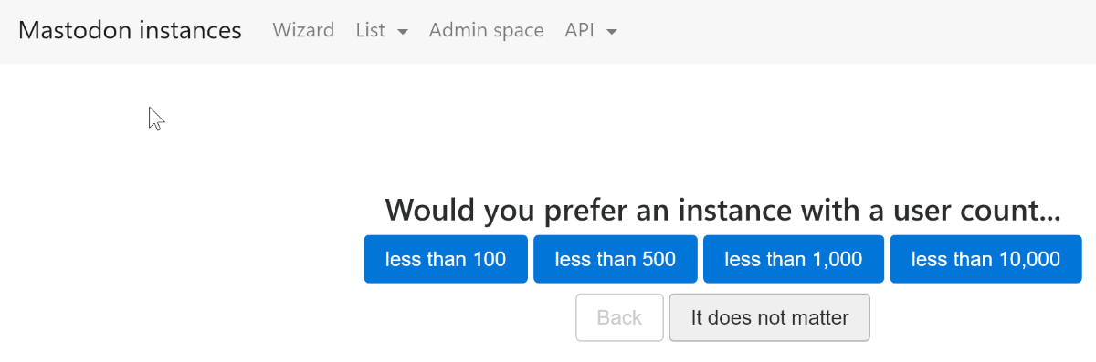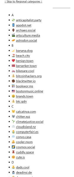 Просто алфавитный список серверов Mastodon. Фишка в том, что здесь собраны интересные и забавные имена серверов. Список наполняется вручную, нет поиска, зато есть разделение по странам.