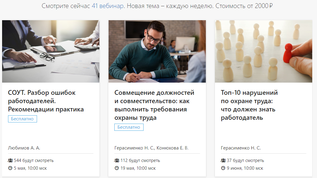 Каждую неделю происходит обновление тематик. Например, «Совмещение должностей и совместительство», «Проверка Росприроднадзора. Как подготовиться и чего ожидать», «Инструктажи по БДД и режим работы» и другие, не менее актуальные темы.