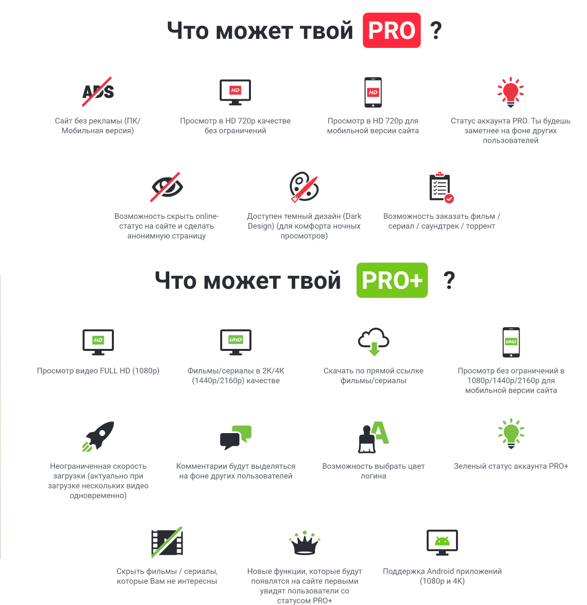 Есть два типа подписки: PRO за 99 рублей в месяц и PRO+ за 169 рублей в месяц. Обе подписки дают сомнительные «фишки» вроде скрытия своего статуса на сайте, тёмного дизайна и тому подобное. Есть и полезные: просмотр видео в максимальном качестве, скачивание сериалов и тому подобное. Есть только Android-приложение.