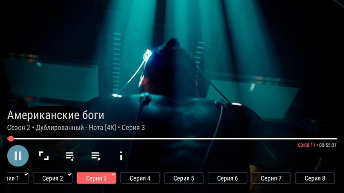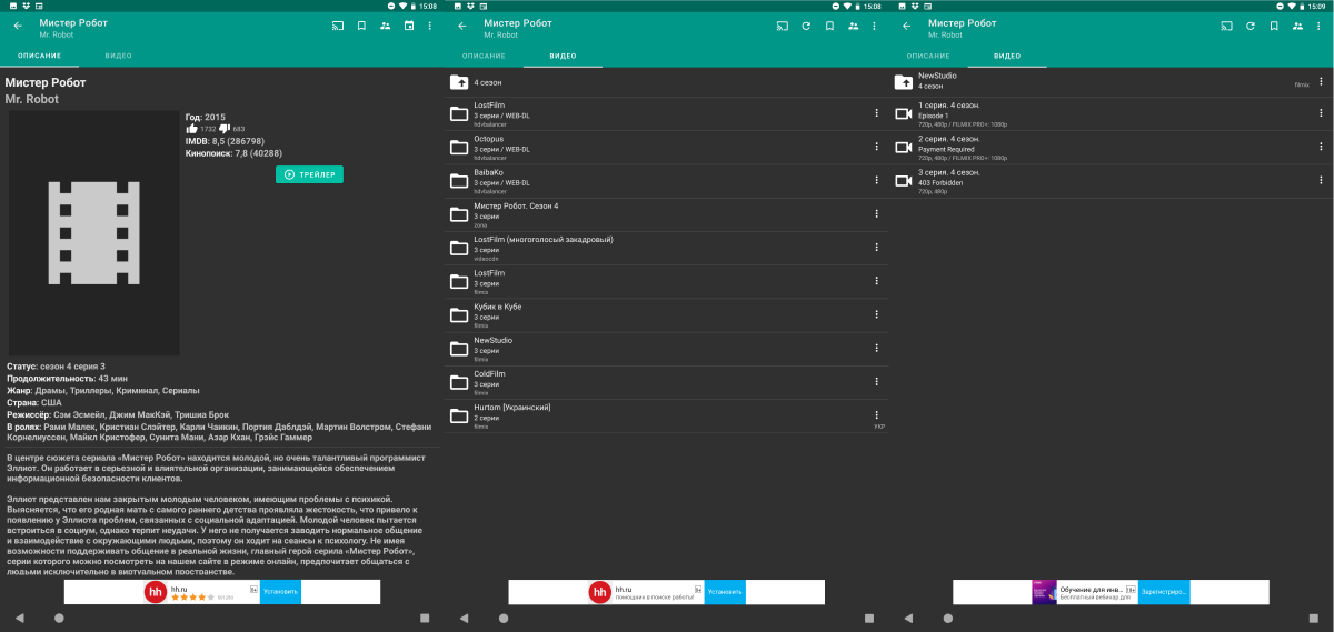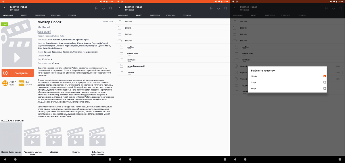 Воспроизведение на Chromecast c Android идёт через сторонний плеер, но проблем с запуском я не заметил. Есть поиск торрентов или просмотр онлайн. При воспроизведении можно выбрать перевод и качество. В самих сериалах может встречаться навязчивая реклама.