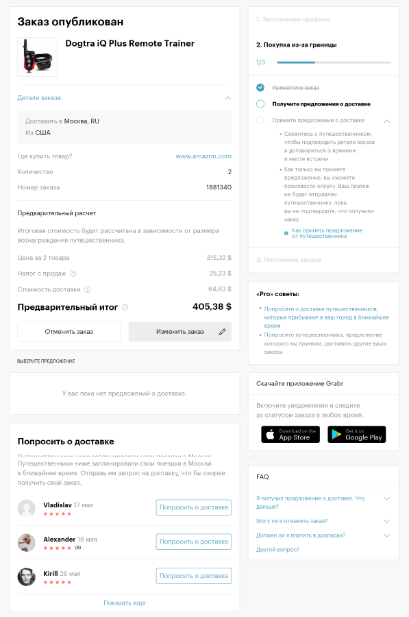 На следующем шаге отображается сводная информация о вашем заказе со стоимостью доставки и налоговым сбором штата. После этого остаётся ждать предложений путешественников или вручную предложить доставку одному из путешественников, который скоро отправится по маршруту.