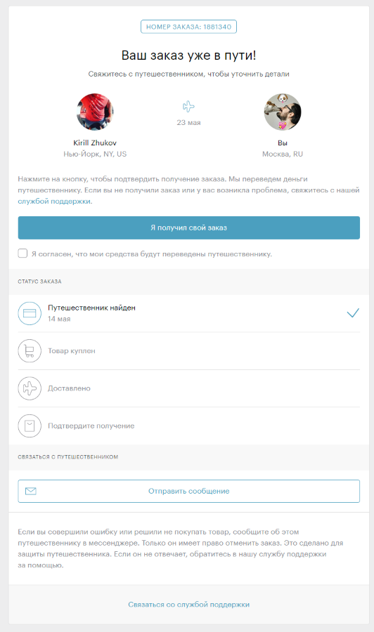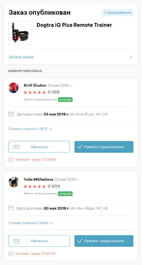 После этого остаётся только нажать кнопку Принять предложение и оплатить заказ. Путешественник сам выкупит товар удобным ему способом и доставит его прямо вам в руки, когда вернётся в город доставки.