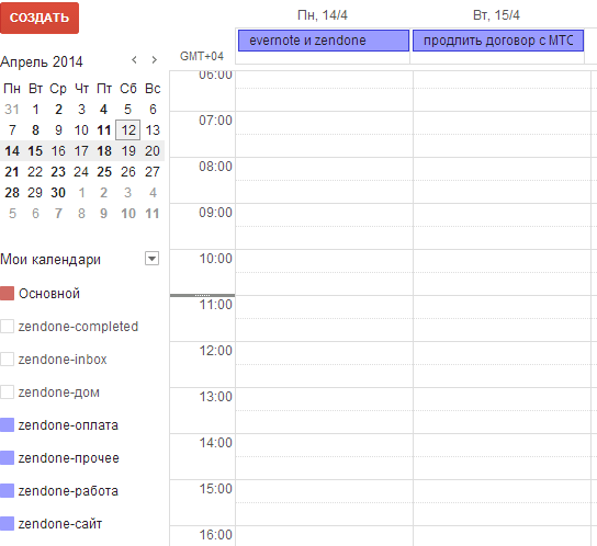 Для каждой «зоны ответственности» Zendone создаёт свой блокнот в Google Calendar. Если у задачи есть дедлайн, то она автоматически отобразится в вашем календаре.