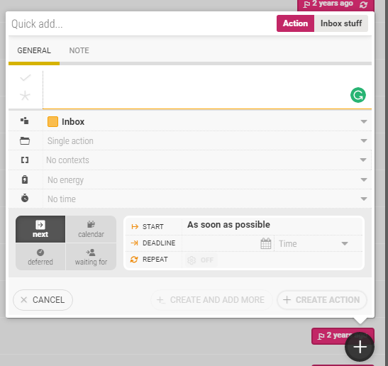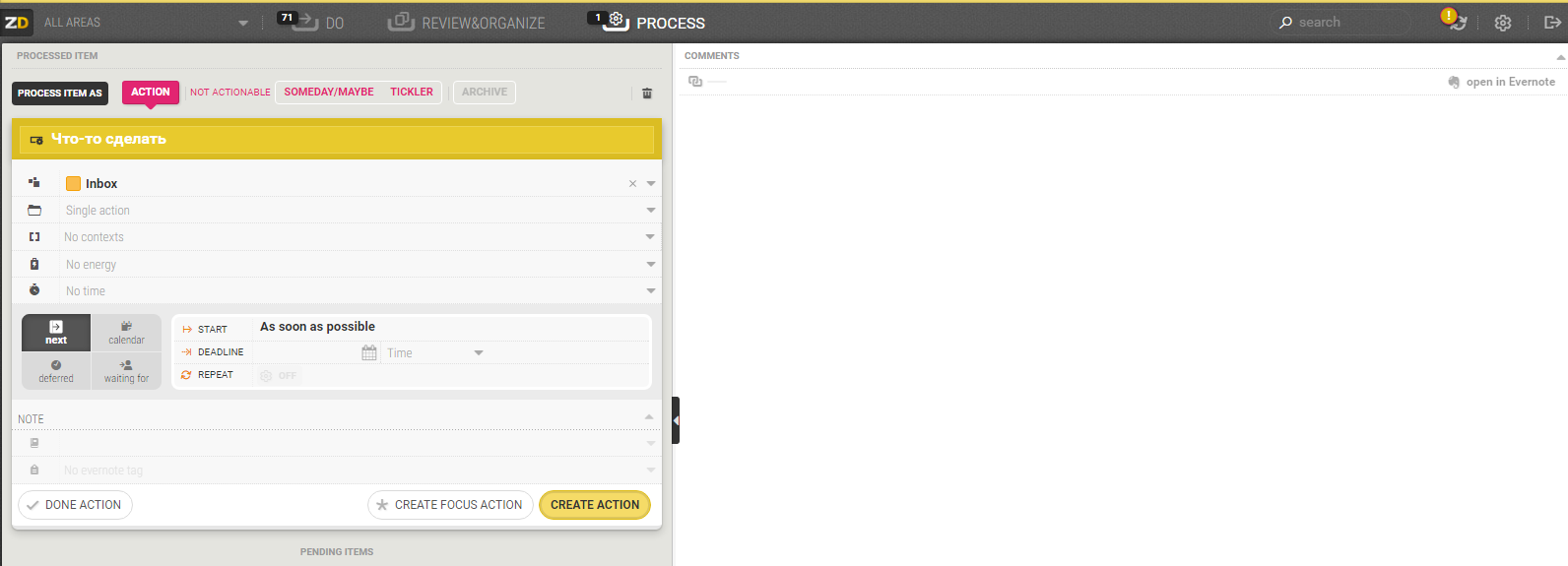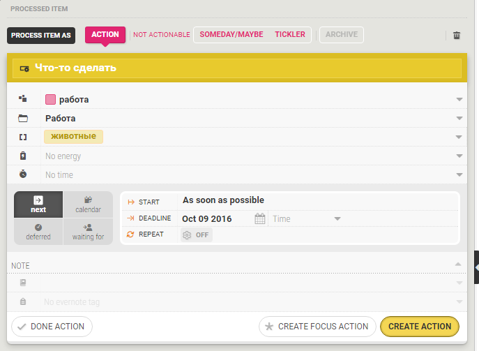 В этом разделе вы можете обрабатывать все «входящие» заметки из вашего аккаунта. Если заметка является задачей, то вы просто добавляете к ней проект, дату, если нужно, и контекст. Затем жмёте «Create Action» и всё — задача создана.