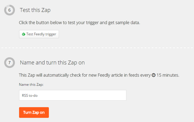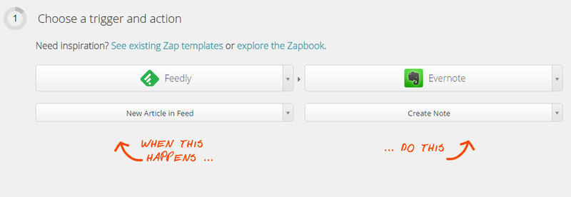Я указал Feedly в качестве триггера. Когда появляется новая статья в RSS ленте, Zapier создает новую заметку в Evernote.