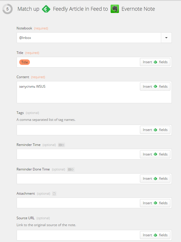 На пятом шаге я указываю параметры заметки, которая будет создана в Evernote. В моем случае будет создана новая заметка в блокноте Inbox (это блокнот, с которым работает Zendone). Название заметки будет равно названию статьи, а в ее содержании будет написано: "Запустить WSUS".