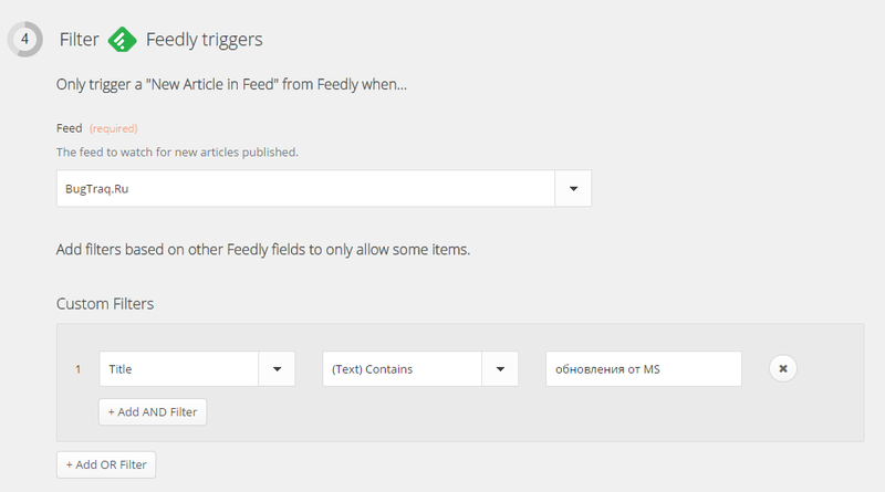 Я не хочу чтобы все подряд статьи из RSS ленты копировались в Evernote, поэтому я настроил фильтр. В моем случае, я хочу чтобы в Zendone появлялась задача установить обновления от Microsoft. Потому что необязательные обновления нужно ставить от руки и я не хочу забыть про это. Я выбрал фид сайта BugTraq.ru и триггер будет срабатывать, если в фиде появляется статься, название которой оканчивается на "обновления от MS".