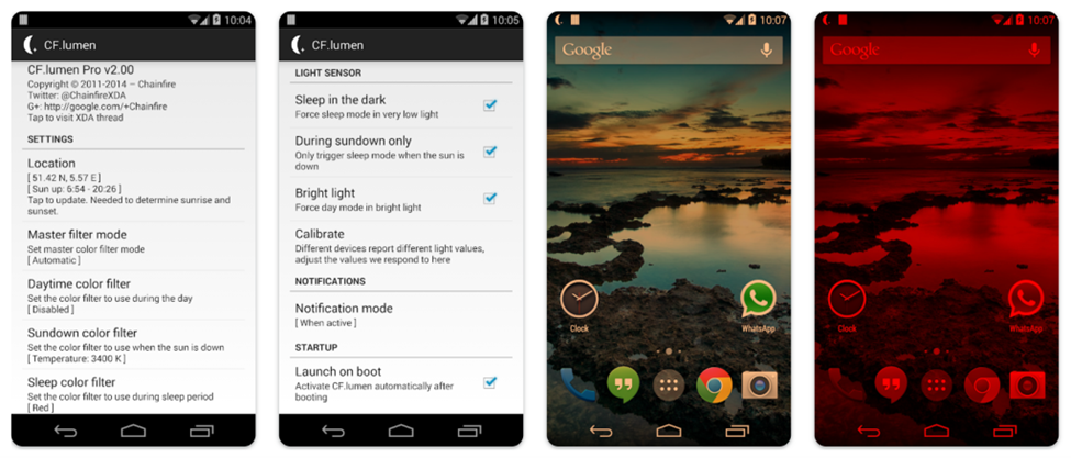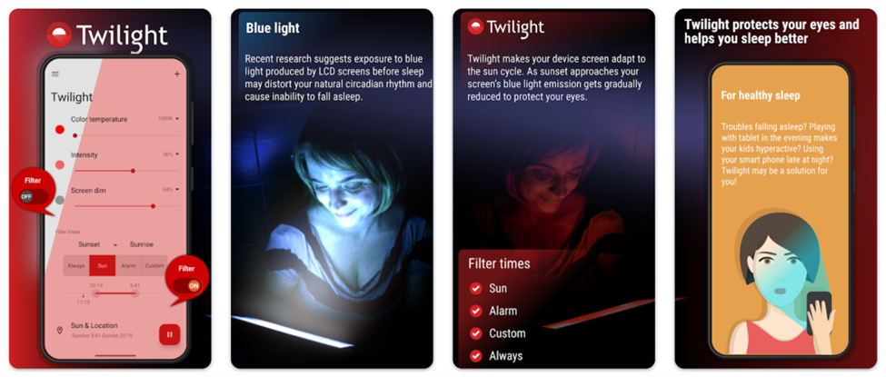 Like the well-known blue light filter program F.lux for PC, Twilight, one of the top Screen Brightness Control Apps can detect when it's about to get dark and then automatically change the screen temperature (the amount of green light output) to keep your circadian rhythm as close to an ideal state as possible. After the sun goes down, Twilight uses warm intensity and blue light filters to lower the screen temperature.