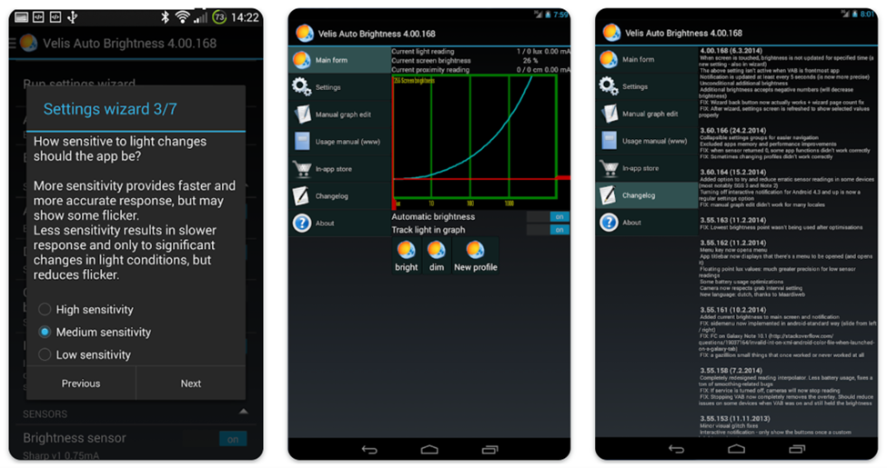 Velis also has many other cool features, including super dimming, which makes the screen darker than the Android minimum brightness, and many options for customizing the automated brightness charts.