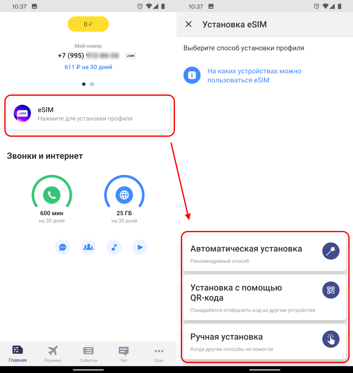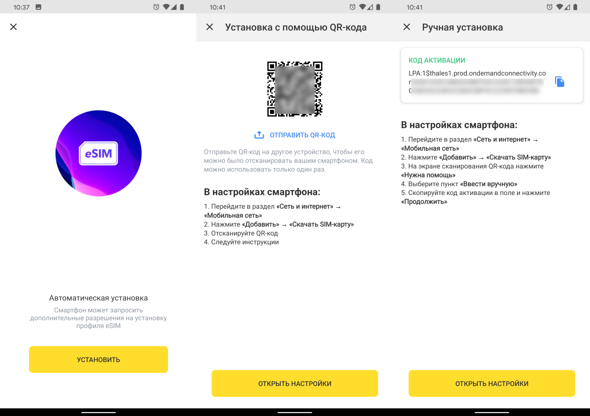 После авторизации в приложении нужно нажать кнопку установки профиля eSIM и выбрать один из способов активации.