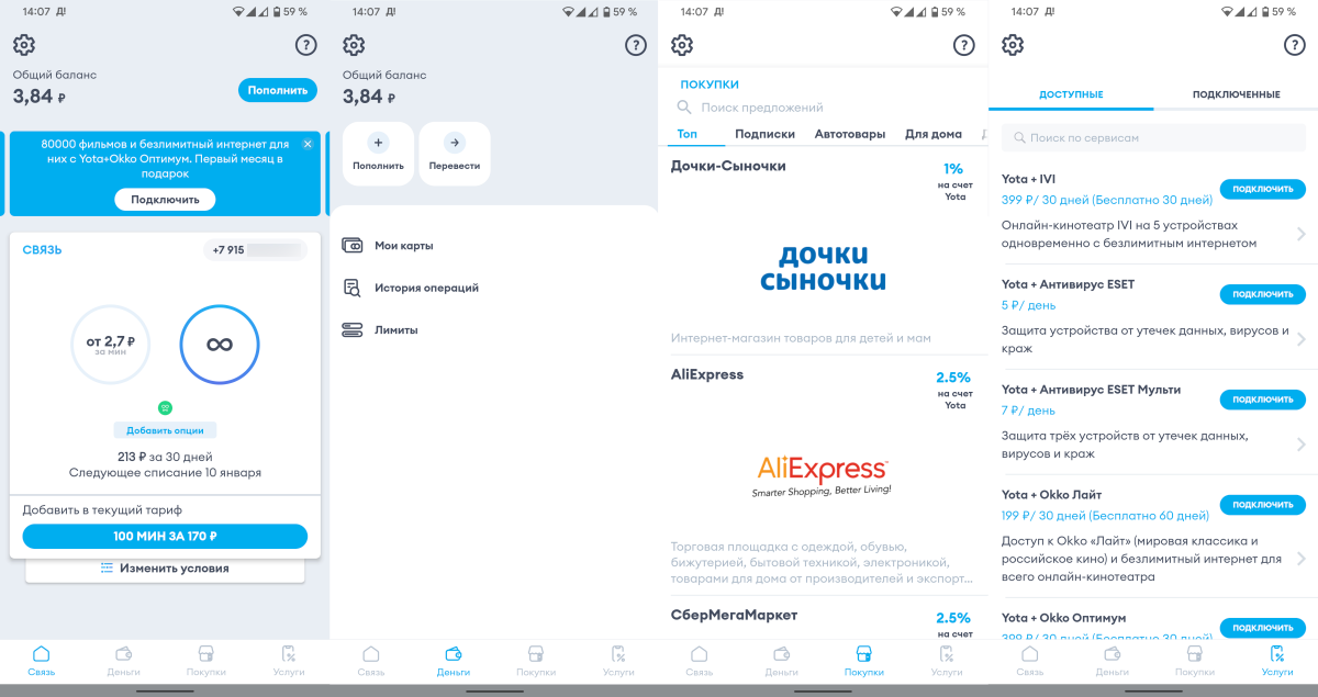 На момент написания этой статьи через приложение можно получать кешбэк у партнёров (AliExpress, Яндекс.Такси и пр.) или покупать различные бандлы приложений (мобильная связь + Okko). Скажу честно, пользоваться всеми этими фишками не очень удобно. Я пытался пользоваться скидками на такси, и для этого надо было зайти в приложение Yota, найти там такси, активировать кешбэк, запустить приложение такси и только потом уже поехать по делам.