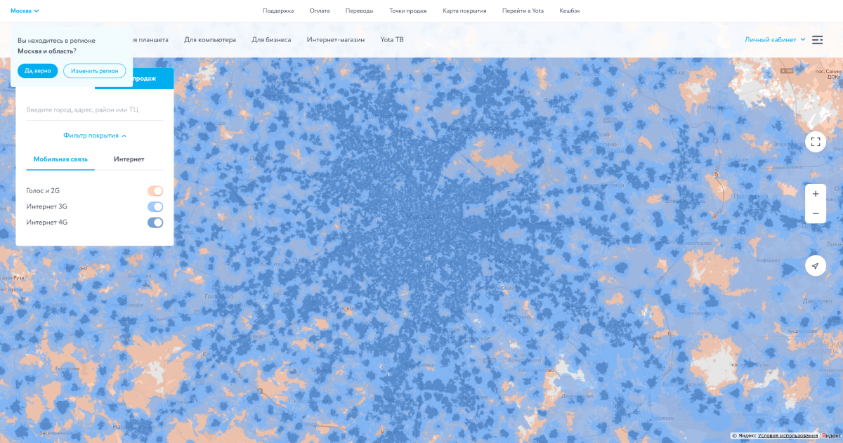 Yota — это один из операторов мобильной связи, который за это время стал сильным конкурентом знаменитой большой тройки операторов. Но тут стоит учесть, что по факту оператор работает на базе сети Мегафон, и в теории все проблемы этой сети распространяются и на Yota. Ознакомиться с картой покрытия в вашем городе можно по этой ссылке.