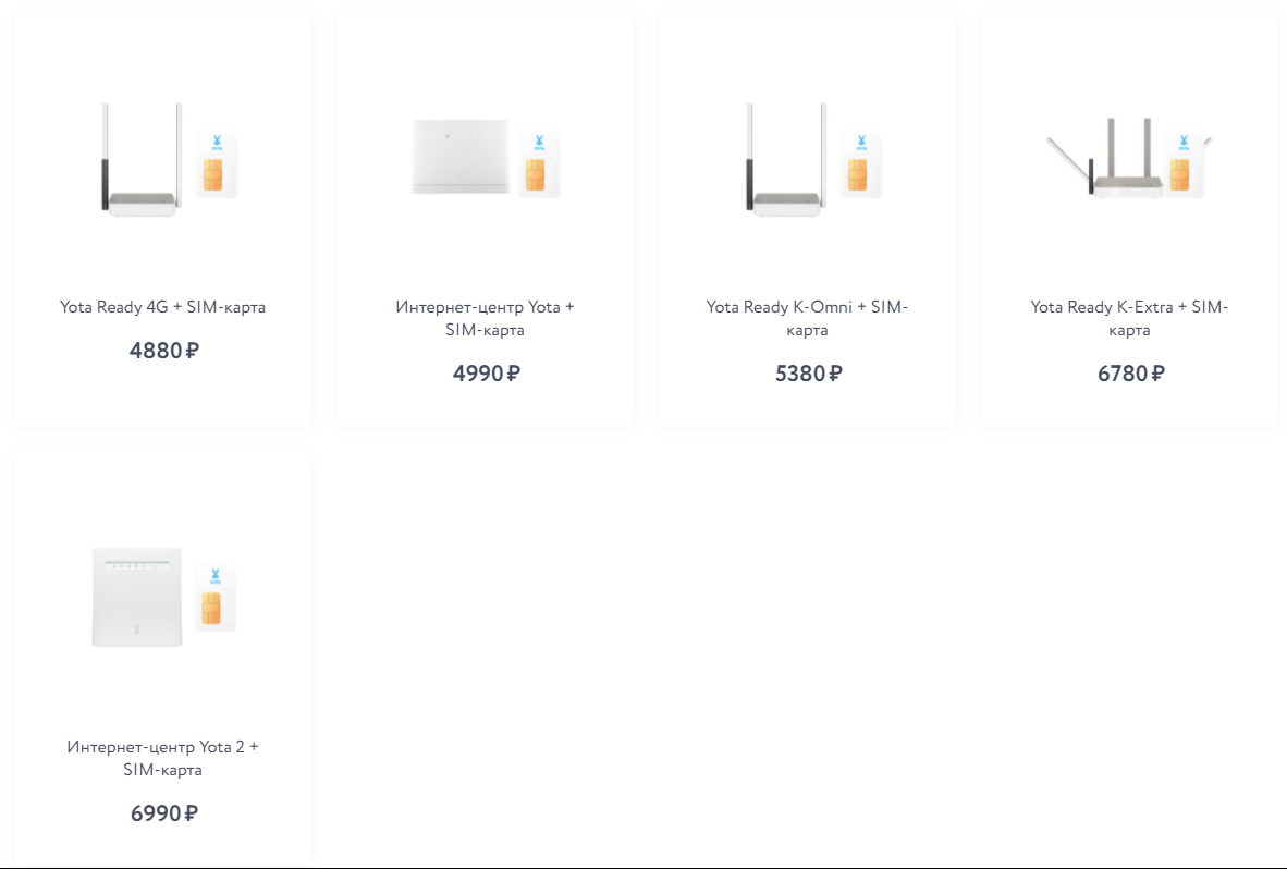 У Yota есть различные типы модемов и роутеров для различных задач и случаев. Ознакомиться со списком гаджетов можно по этой ссылке.