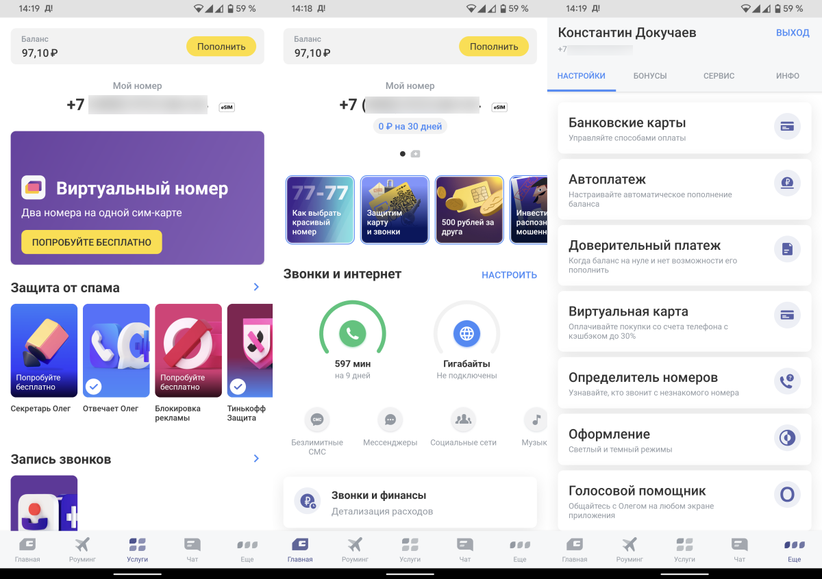 В плане удобства и лаконичности интерфейса Тинькофф Мобайл значительно выигрывает у Yota. Но, как я говорил выше, обоими приложениями я пользуюсь очень редко, поэтому наплевать.