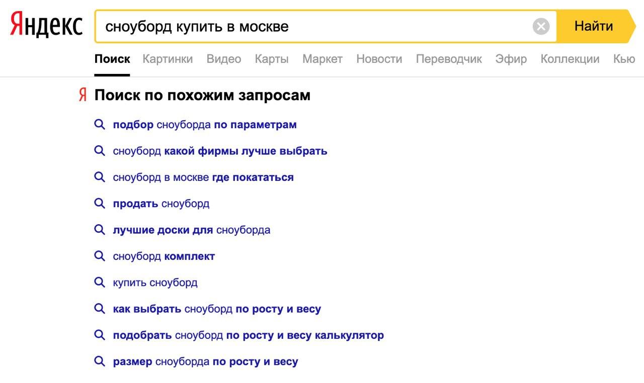 Например, если пользователь ищет, где купить сноуборд, поиск предложит «Как подобрать сноуборд по росту и весу». У разработчиков к таким рекомендациям есть три основных требования: