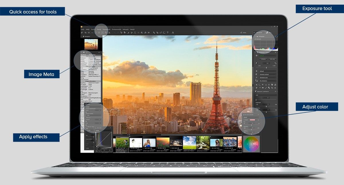 Программное обеспечение для улучшения изображений. Помимо стандартных функций настройки экспозиции, баланса белого и контрастности, SILKYPIX предлагает ещё 66 дополнительных фильтров, режим шумоподавления Fine Detail и инструмент для коррекции перспективы.