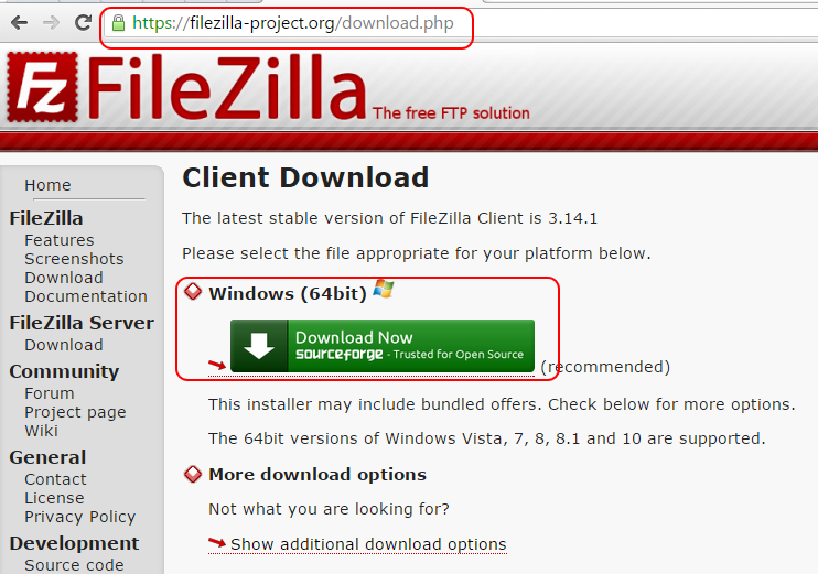Программа скачивается с сайта FileZilla. Нужно выбрать версию для Windows x64: