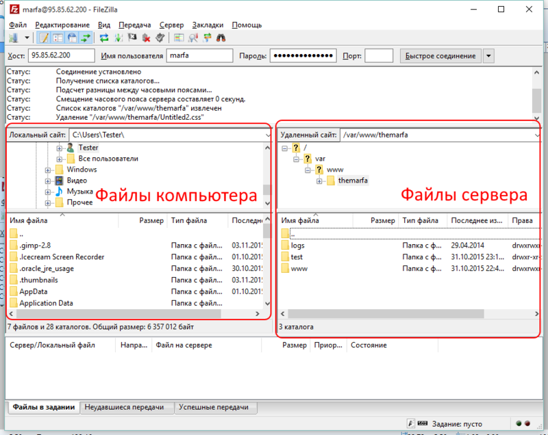 На панели слева находятся файлы компьютера, а на панели справа файлы FTP-сервера: