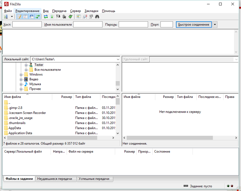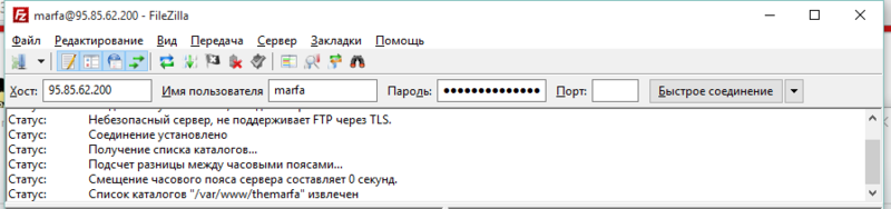Для подключения к FTP-серверу в верхней части окна нужно указать Хост (адрес сервера), имя и пароль доступа. После чего нажать Быстрое соединение:
