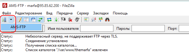 В дальнейшем для подключения к сохраненным серверам можно использовать кнопку Менеджера Сайтов на верхней панели: