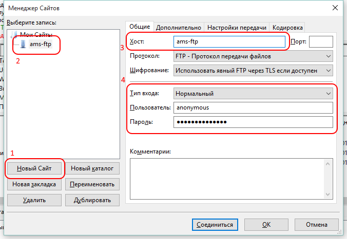 Сохранить текущее подключение можно через меню Файл/Копировать текущее соединение в Менеджер Сайтов... Или непосредственно из Менеджера. Для этого в Менеджере Сайтов нужно нажать кнопку Новый сайт, затем указать имя сайта и адрес хоста. В разделе Тип входа выбрать Нормальный, а в полях Пользователь и Пароль указать данные для входа. Остальные раздела изменять не нужно. После чего нажать OK.