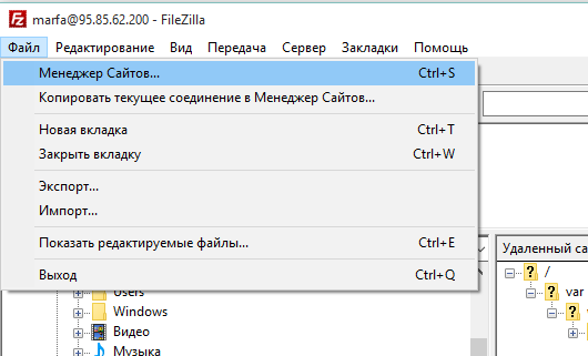 Для последующих подключений рекомендуется использовать Менеджер сайтов. Его можно вызвать сочетанием клавиш CTRL+S или через меню Файл/Менеджер сайтов...: