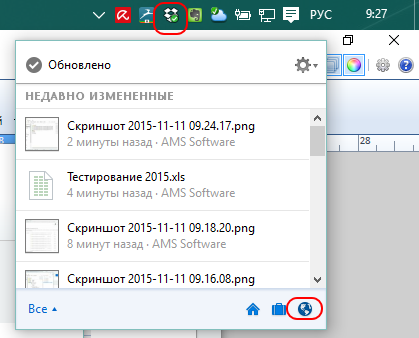 Удаленные файлы и папки можно восстановить через веб-интерфейс Dropbox. Чтобы перейти в него нажмите правой кнопкой по иконке Dropbox рядом с часами и нажмите на иконку в виде Земного шара: