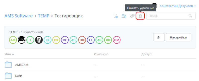 После чего будет открыта вкладка браузера с веб-интерфейсом программы. В нем нужно перейти в папку, в которой раньше находился удаленный файл, и нажать кнопку Показать удаленные: