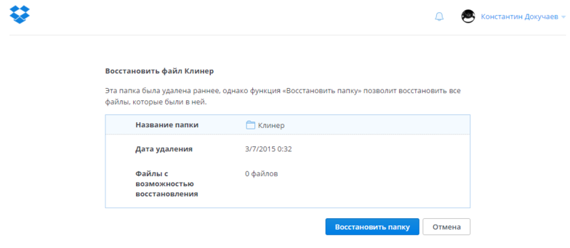 При восстановлении папки будет открыто вот такое окно, где нужно будет нажать Восстановить папку: