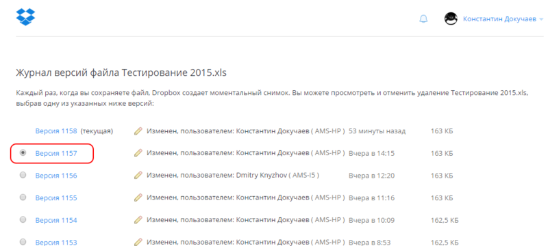 После чего в браузере откроется страница со всеми предыдущими версиями файла. Для выбора старой версии нужно активировать радио-баттон рядом с ней:
