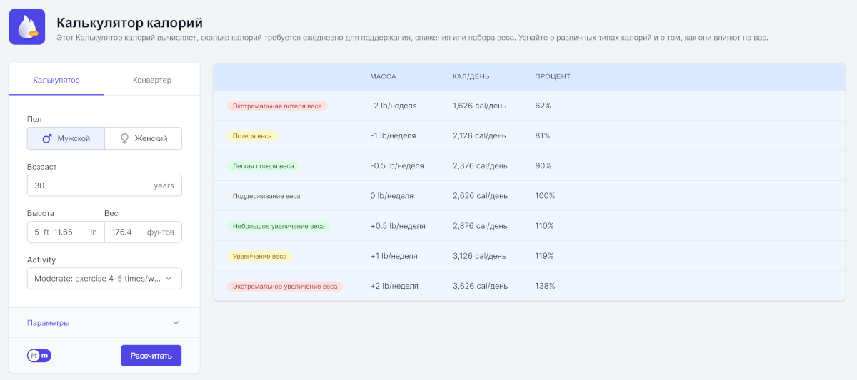 С другой стороны, если вы стремитесь набрать вес, калькулятор калорий может рассчитать вашу дневную норму калорий для набора мышечной массы. Вы сможете узнать, сколько калорий вам следует добавить в свой рацион, чтобы достичь желаемого результата.