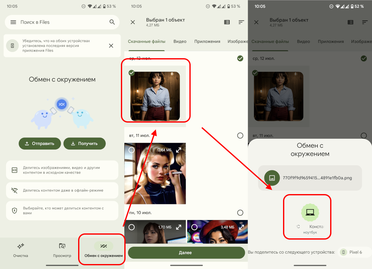 Обмен с окружением или Nearby Share это такой аналог AirDrop для Android, который позволяет передавать файлы между ближайшими устройствами по Bluetooth или Wi-Fi без дополнительных настроек и приложений.
