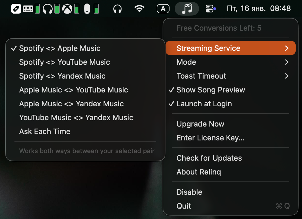 Если вы пользуетесь macOS, то вы можете установить приложение Relinq, которое автоматически предложит конвертировать скопированную ссылку на трек между различными сервисами.
