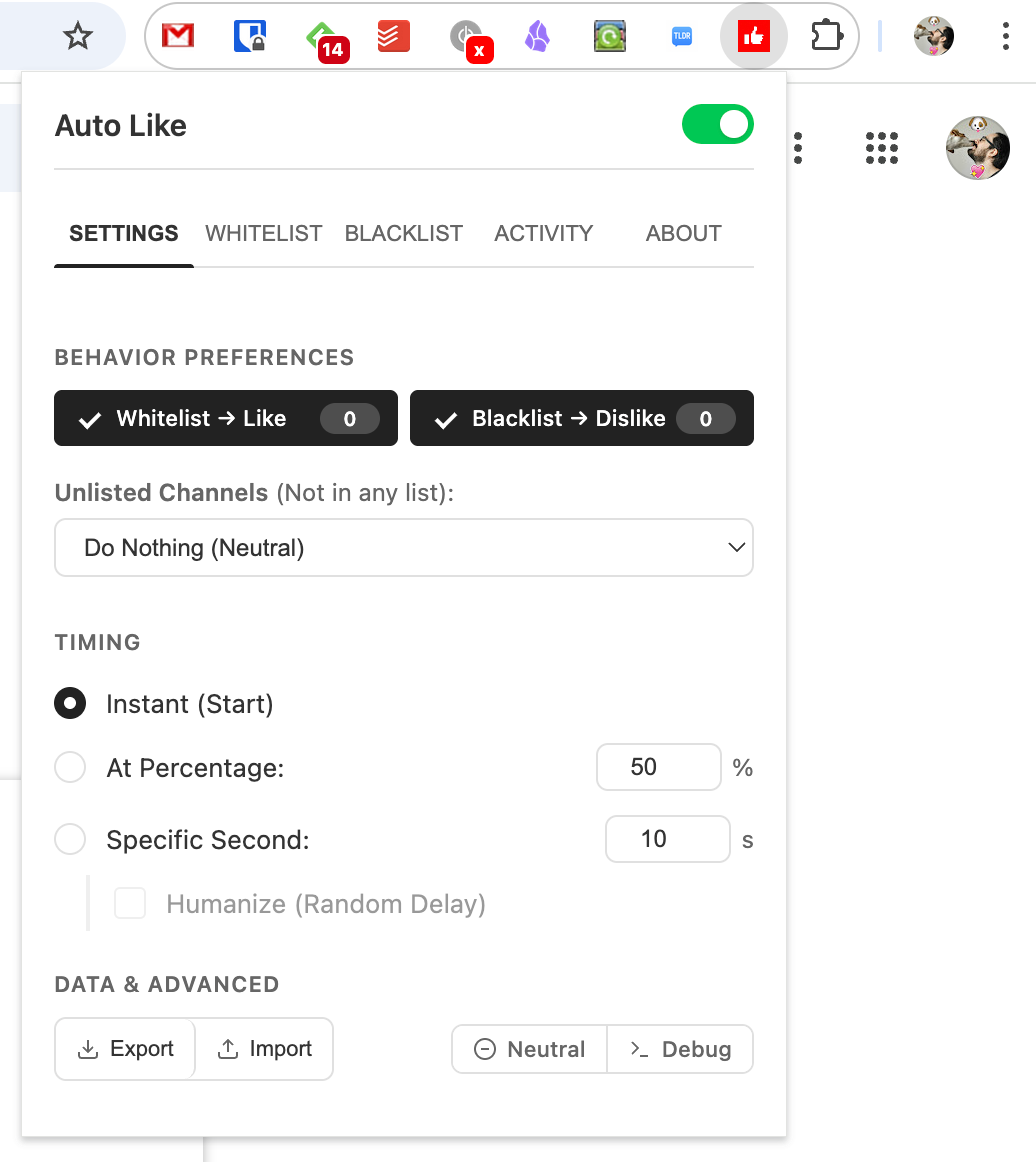 После его установки вы можете настроить автоматическое прожатие лайка или дизлайка для каналов из белых и чёрных списков. При этом вы можете указать правила, когда именно нужно прожать эту кнопку: сразу, через какой-то процент просмотра видео, или по времени.