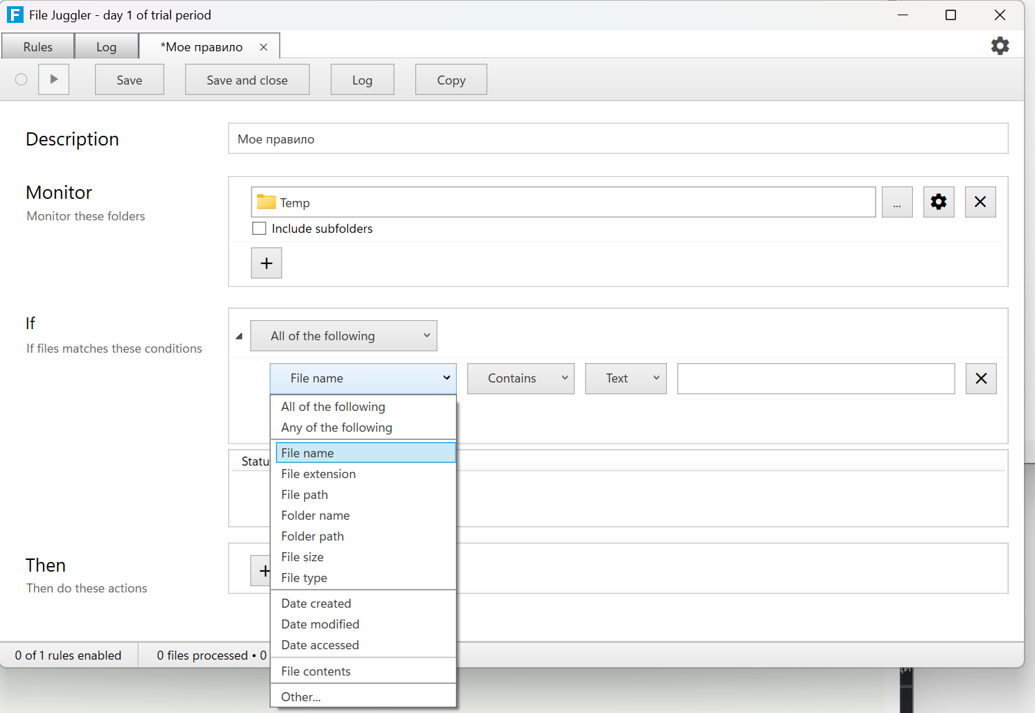 Далее вы указываете триггер, на основе которого что-то должно быть. Это может быть имя файла, пути, папки, размер, дата изменения, содержимое файла и многое другое. Можно создавать различные комбинации и условия, включая RegExp.