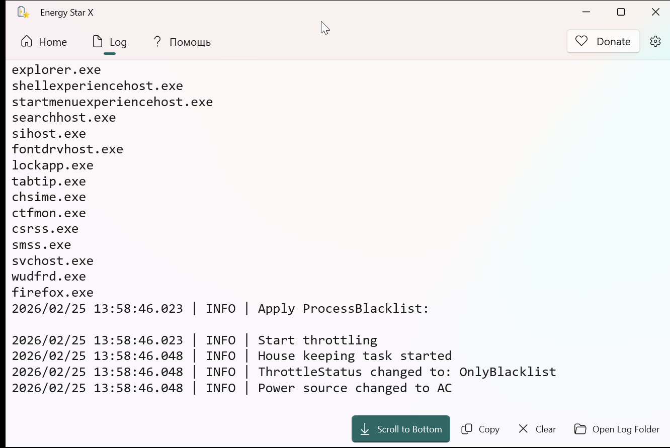 Всё же в настройках можно активировать перевод в указанный режим, даже когда ноутбук подключён к источнику питания. Если Energy Star X работает, то вы увидите соответствующий значок в основном окне, а также заполнение логов.