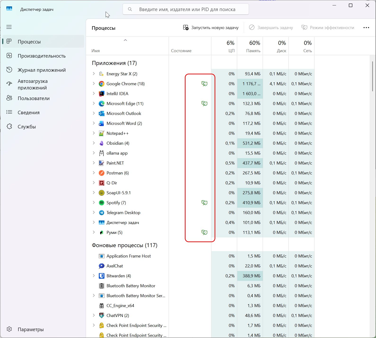 В Windows 11 есть особый режим энергопотребления для приложений — Efficiency Mode. Когда он активен, приложения начинают меньше потреблять ресурсы процессора, что экономит энергию и батарею компьютера.