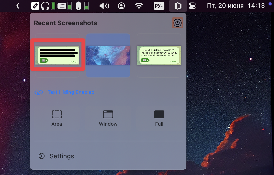 После чего через выпадающее меню или по горячей клавише вы сможете сделать скриншот нужной области, а Shhshot автоматически скроет данные на нём.
