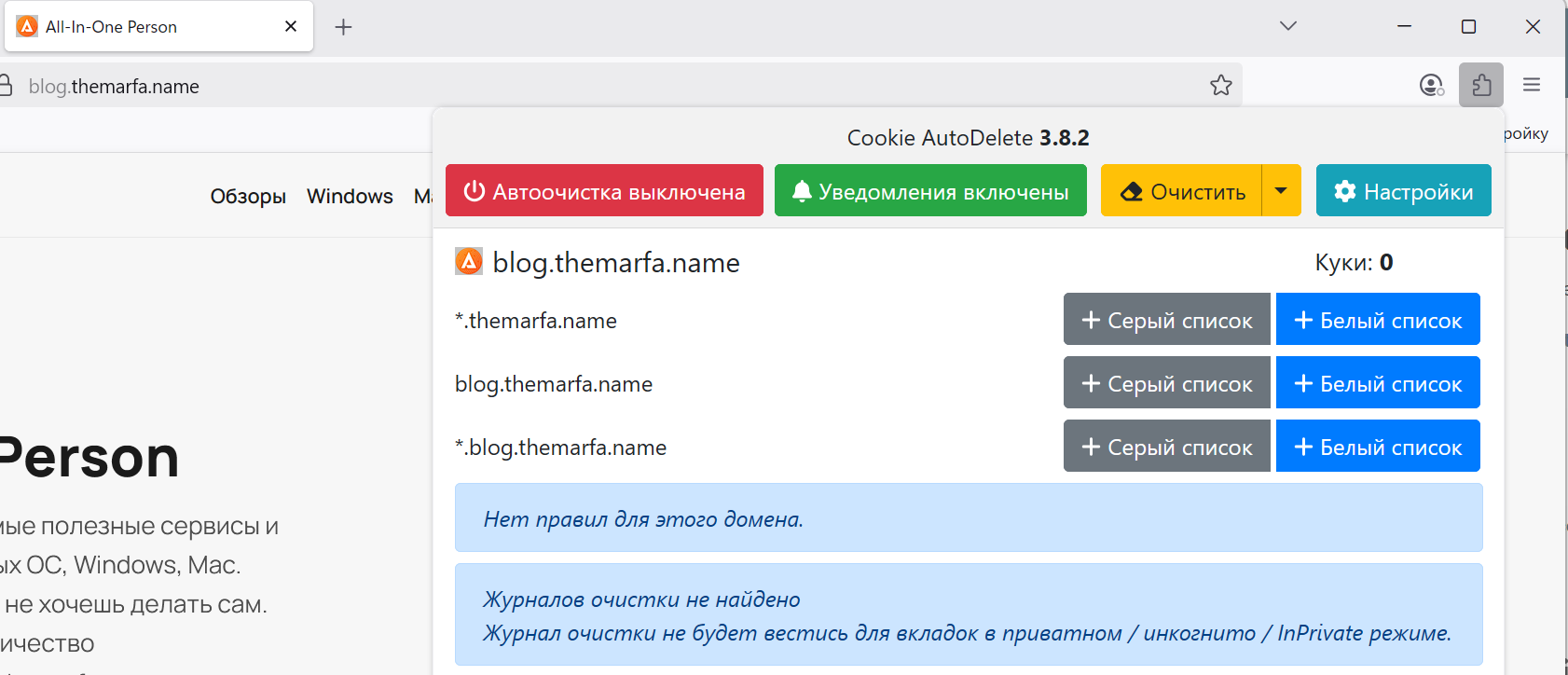 В случае если автоочистка включена, то при закрытии вкладки через некоторое время лишние куки будут автоматически удалены.