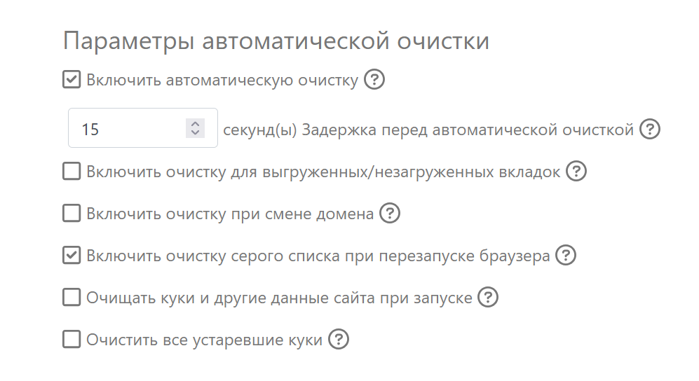 Управлять параметрами удаления можно в настройках расширения. Здесь можно выставить таймаут и правила удаления: при закрытии браузера, при его запуске, при смене домена и прочие параметры.