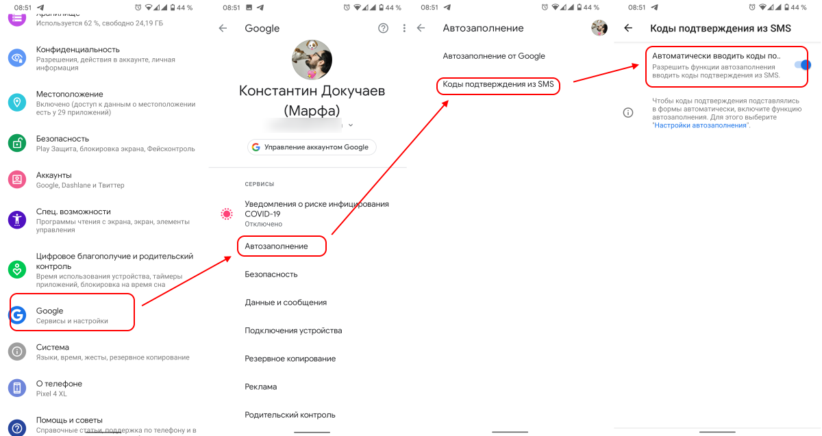 Для активации автоматического ввода кодов из СМС на Android откройте Настройки и перейдите в раздел Google. Оттуда перейдите в Автозаполнение, затем Коды подтверждения из SMS.
