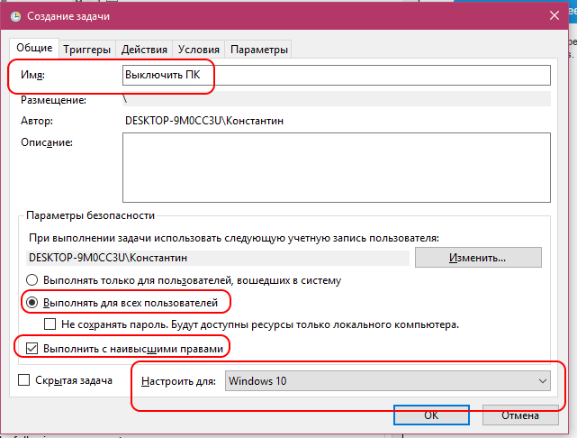 В меню «Действия» найдите пункт «Создать задачу». Во вкладке «Общие», в поле «Имя», укажите название для задачи. Оно может быть абсолютно любым. Кроме этого, нужно указать параметр «Выполнять для всех пользователей», выставить галочку «Выполнять с наивысшими правами», после чего настроить задачу для Windows 10.